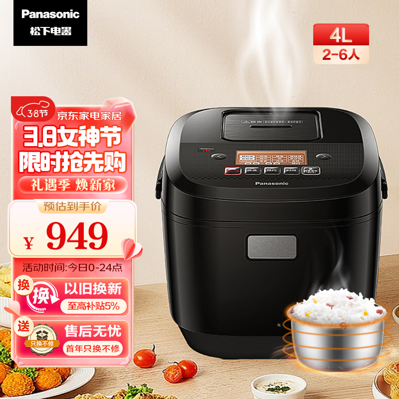 松下(Panasonic)电饭煲电饭锅4L远红外立体包裹式加热IH电磁加热1-6人可预约智能多功能电饭煲黑色 SR-HR152价格:949.00元!