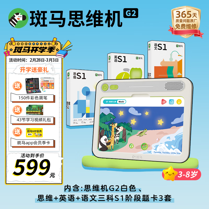 斑马思维机G2 语数英S1阶段 点读学习机 3-8岁儿童玩具男女孩生日礼物价格:679.00元!