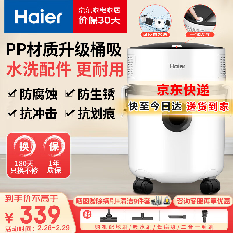 海尔(Haier)桶式吸尘器家用大吸力强力大功率吸尘机干湿两用一键收线HZ-T810W价格:338.00元!