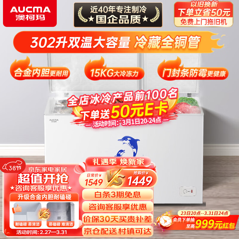 澳柯玛(AUCMA)302升 冰柜家用双温双箱商用家用大容量冰柜卧式冰柜囤货冷柜冷藏全铜管BCD-302CNE以旧换新价格:1499.00元!