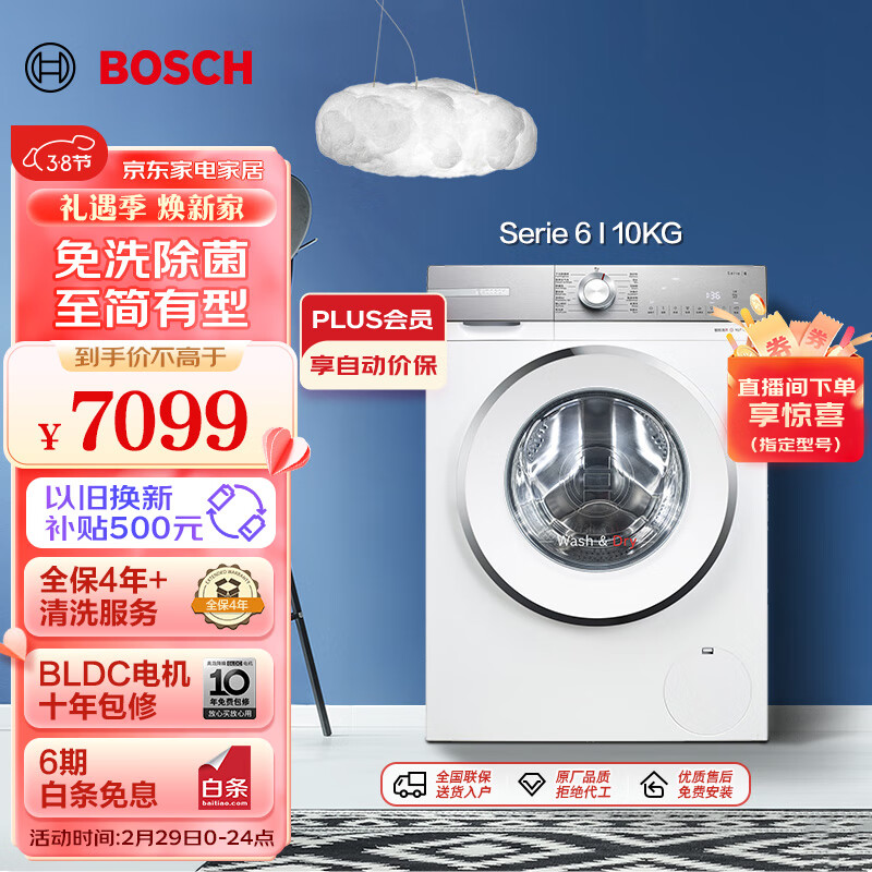 博世(BOSCH)【云朵白·设计师版】6系10公斤大容量1400转滚筒家用全自动洗衣机洗烘干一体机除菌除螨WNB254X00W价格:7099.00元!