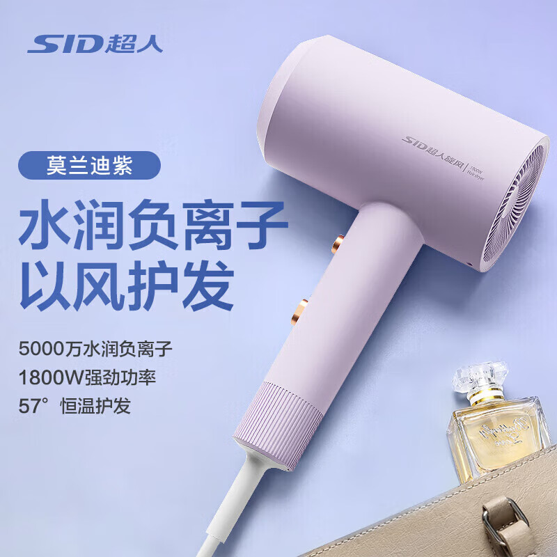 超人(SID)家用电吹风机 5000万负离子护发吹风筒 1800W大风量速干便携简约电吹风DJ818紫价格:109.00元!