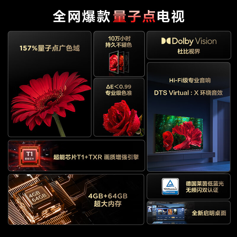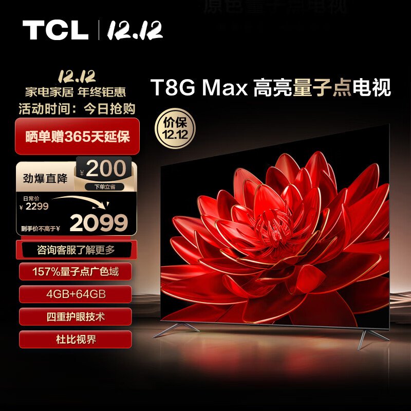 TCL电视 50T8G Max 50英寸 QLED量子点 4+64GB 护眼 4K高清 客厅家用液晶智能平板游戏电视机 小电视价格:2099.00元!