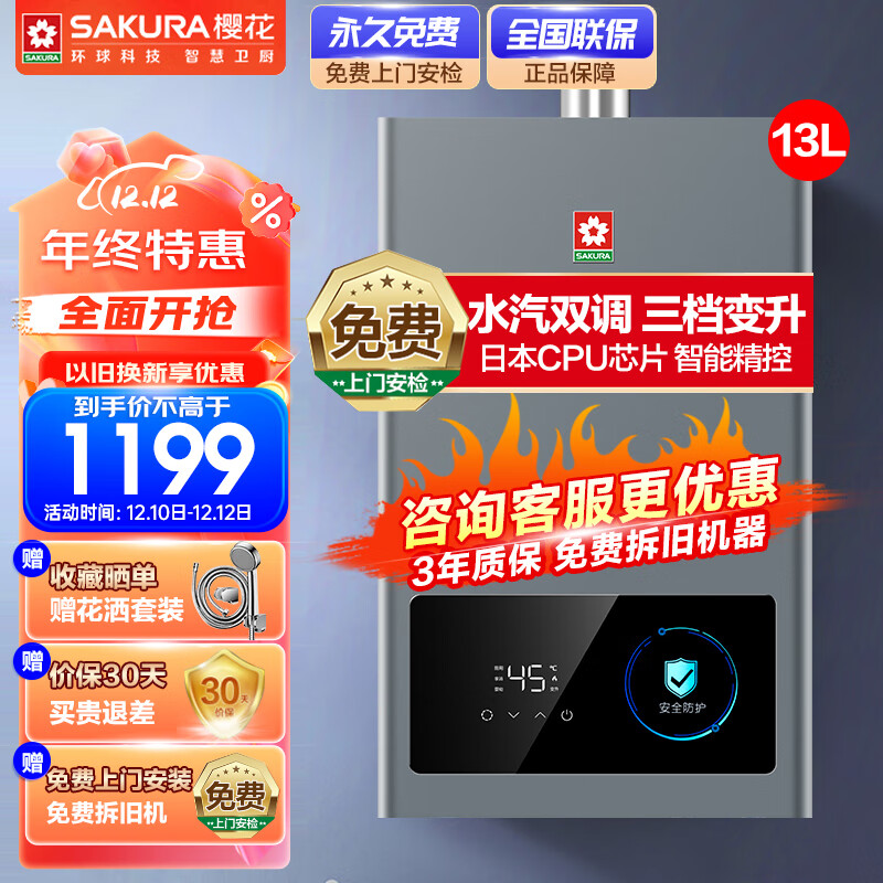 樱花(SAKURA)13升燃气热水器天然气水气双调日本CPU智能精控恒温变频低压启动三档变升多重安防JSQ25-JJP009价格:1199.00元!