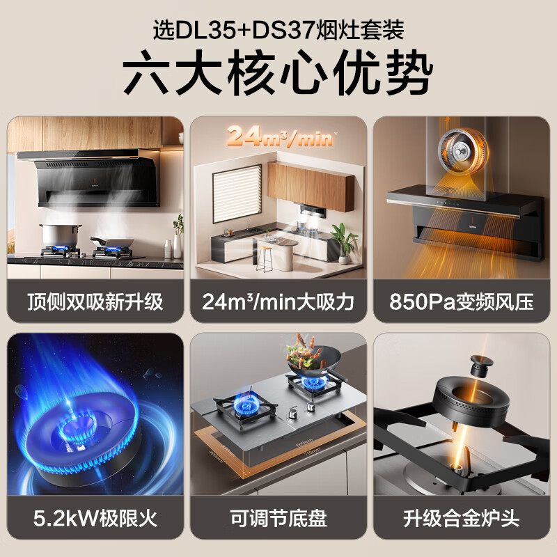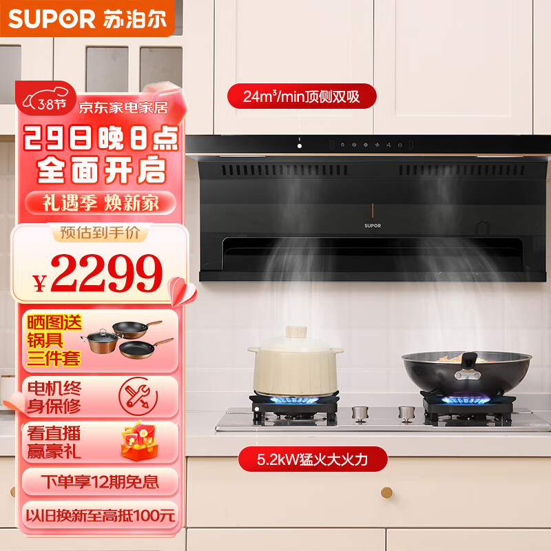 苏泊尔(SUPOR)抽油烟机 双腔拢烟顶侧双吸油烟机灶具套装 24立方大吸力变频烟灶 家用油烟机燃气灶 DL35+DS37天价格:2299.00元!