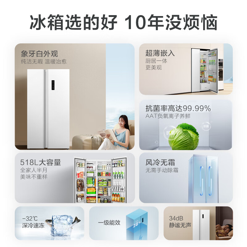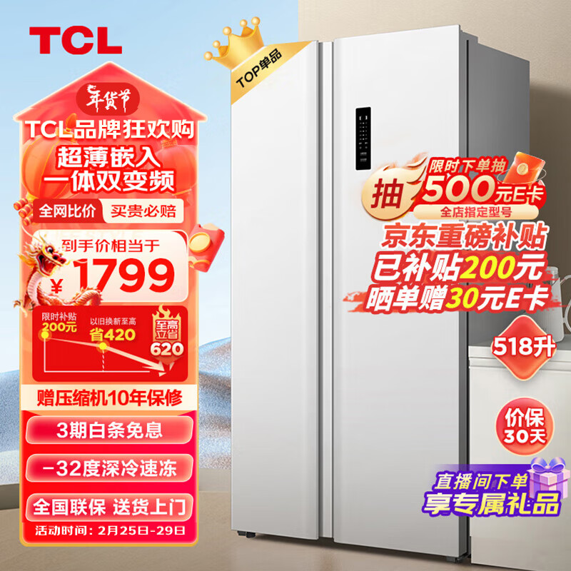 TCL518升大容量养鲜对开双开门白色冰箱一级能效双变频风冷无霜 -32深冷速冻 超薄家用冰箱R518V5-S价格:1799.00元!