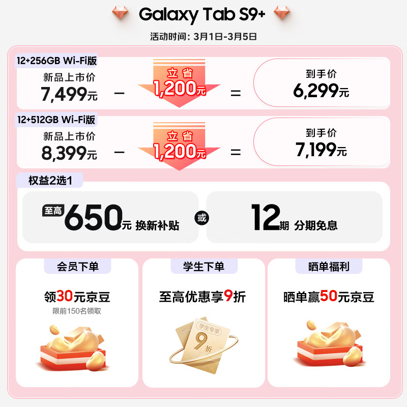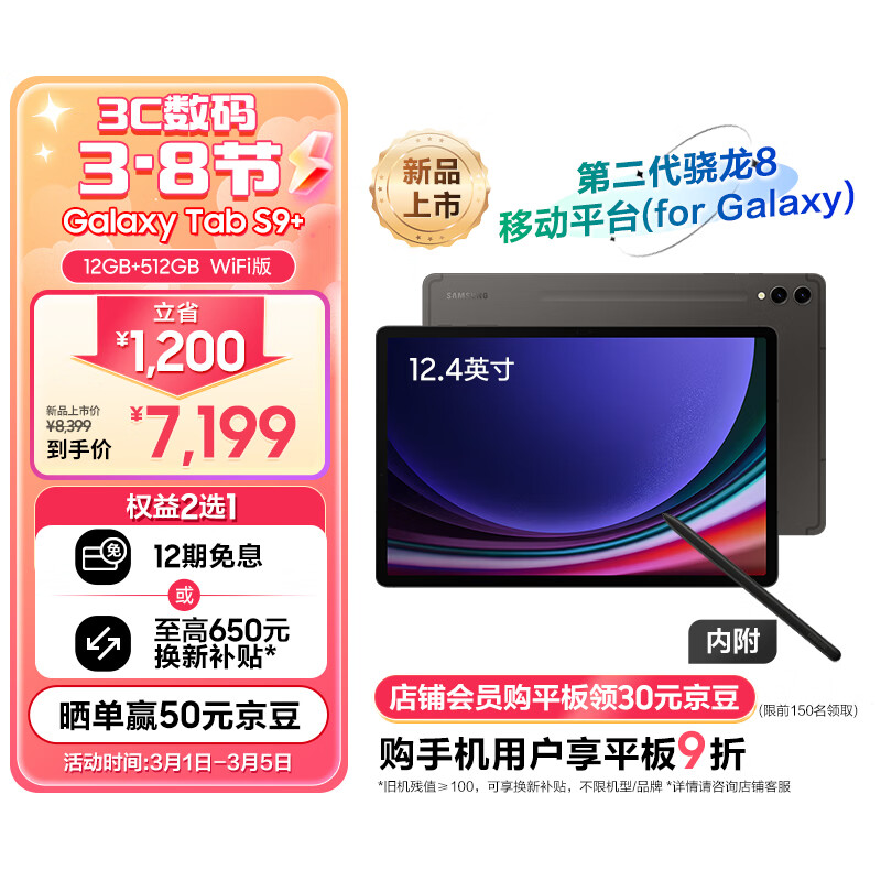 三星(SAMSUNG)S9+ 2023款平板电脑12.4英寸骁龙8Gen2 120Hz 12G+512GB WIFI版学习含触控笔云影灰价格:7199.00元!