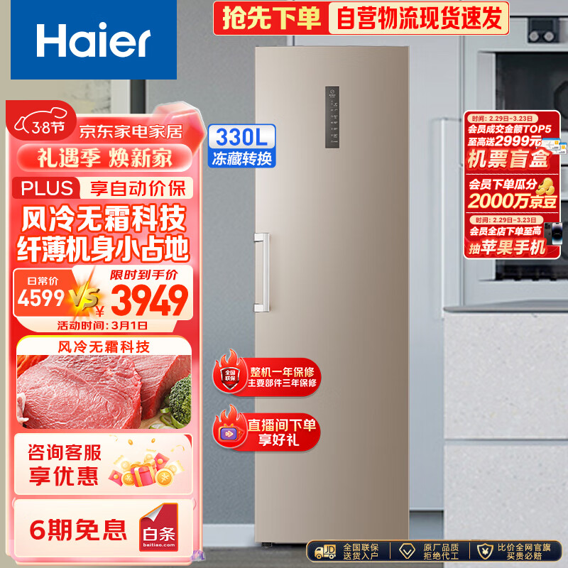 海尔(Haier)330升全冷冻小冰箱风冷无霜大容量家用冷藏冷冻立式冰柜海鲜速冻囤货BD-330WEPTU1以旧换新价格:4099.00元!