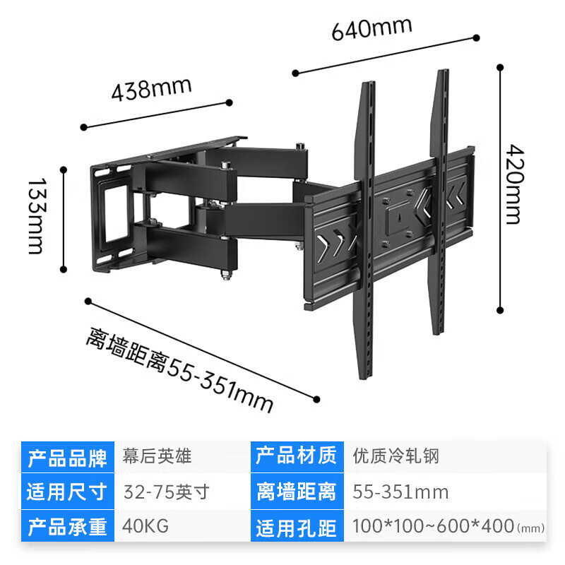 幕后英雄 电视伸缩挂架(32-75英寸)电视支架壁挂通用伸缩旋转电视机架小米海信TCL雷鸟三星索尼电视架价格:99.00元!
