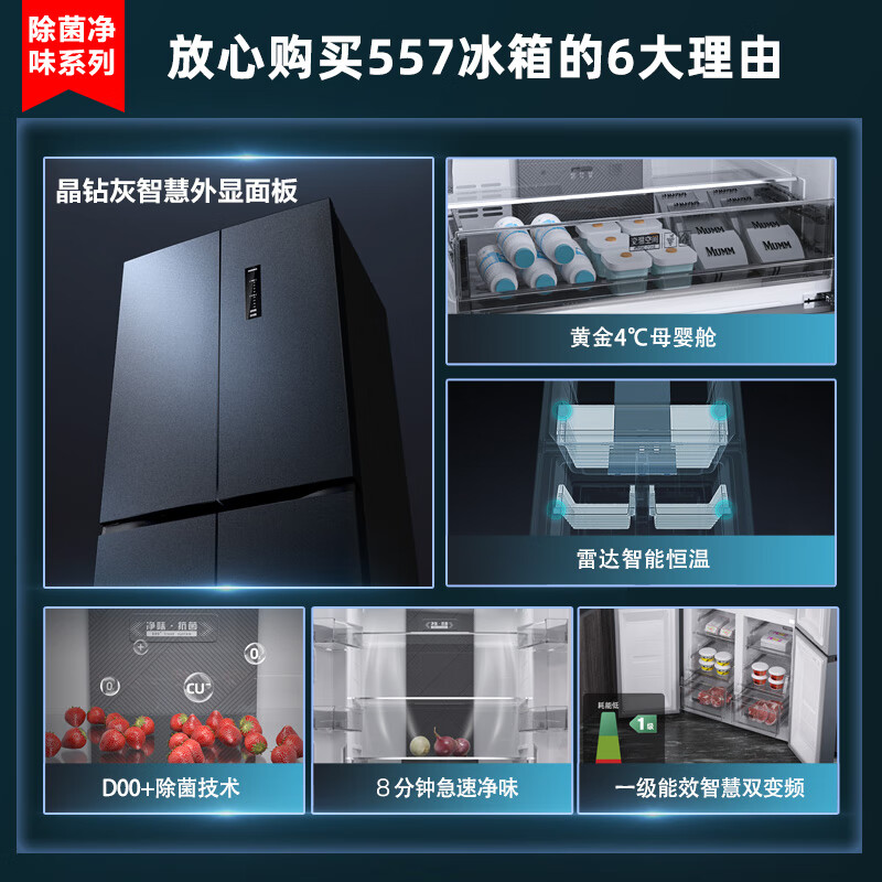康佳557升京东小家智能互联一级能效双变频十字对开双开四开门电冰箱母婴存储风冷无霜BCD-557WEGQ4SP价格:2999.00元!