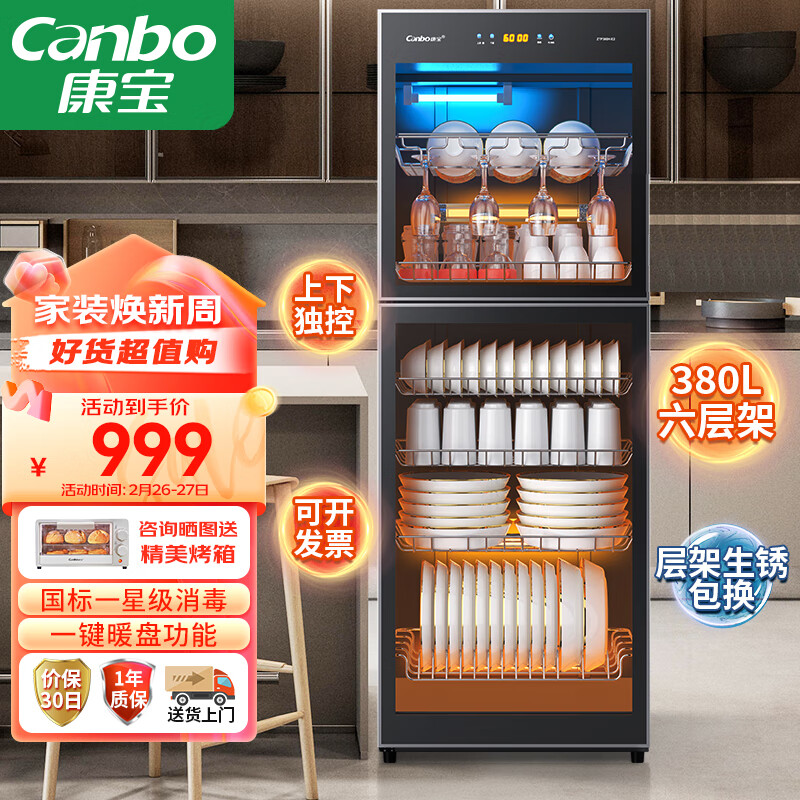 康宝(Canbo)大容量消毒柜立式家用家庭烘干双门商用餐饮食堂饭店厨房餐具紫外线碗筷消毒碗柜ZTP380H-E2价格:1099.00元!