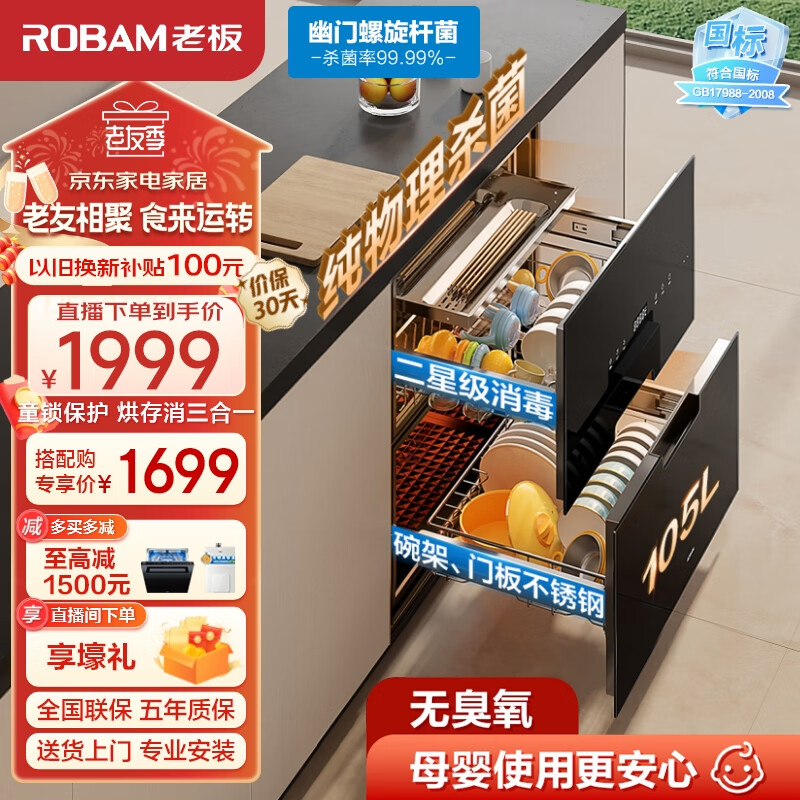老板(Robam)消毒柜家用 嵌入式 消毒碗柜 105L大容量双门三抽无臭氧二紫外线纯物理杀菌消毒柜XB710A价格:1728.00元!