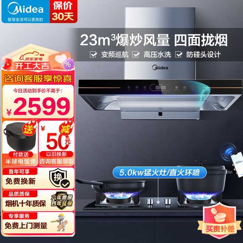 美的(Midea)家用抽油烟机23立方大吸力欧式顶吸油烟机燃气灶具两件烟灶套装一键水洗厨房电器天然气TV701+Q330价格:2599.00元!
