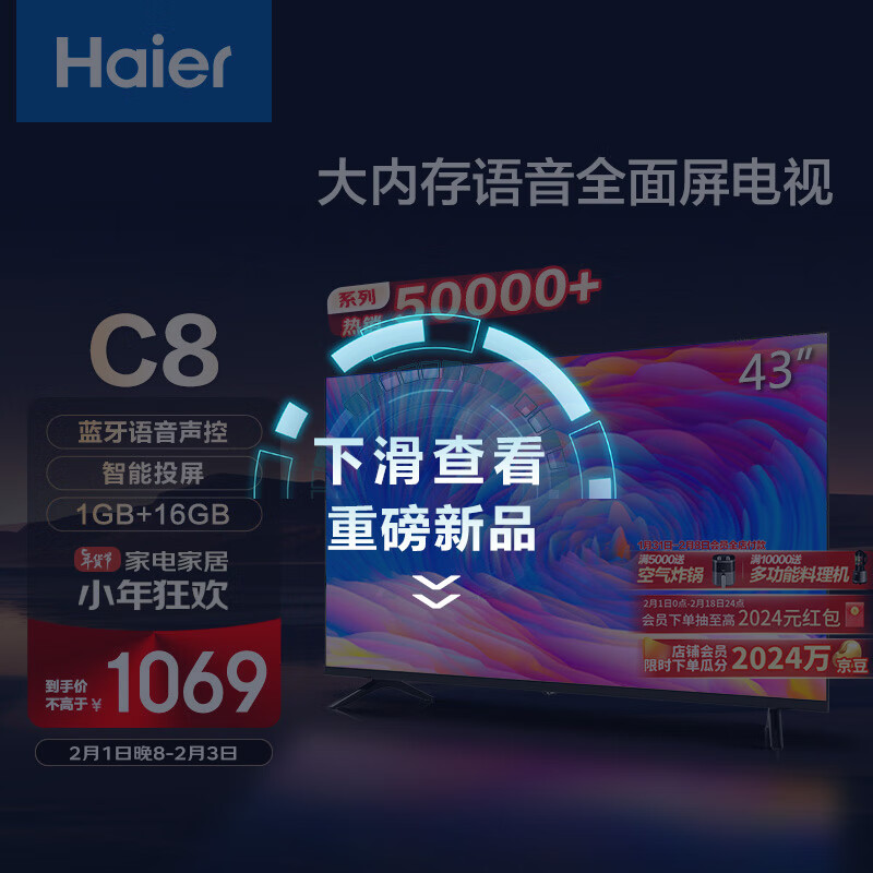 海尔(Haier)LE43C8 43英寸屏高清智能家用老人平板小彩电人工智能语音遥控液晶电视机16G大内存价格:1069.00元!