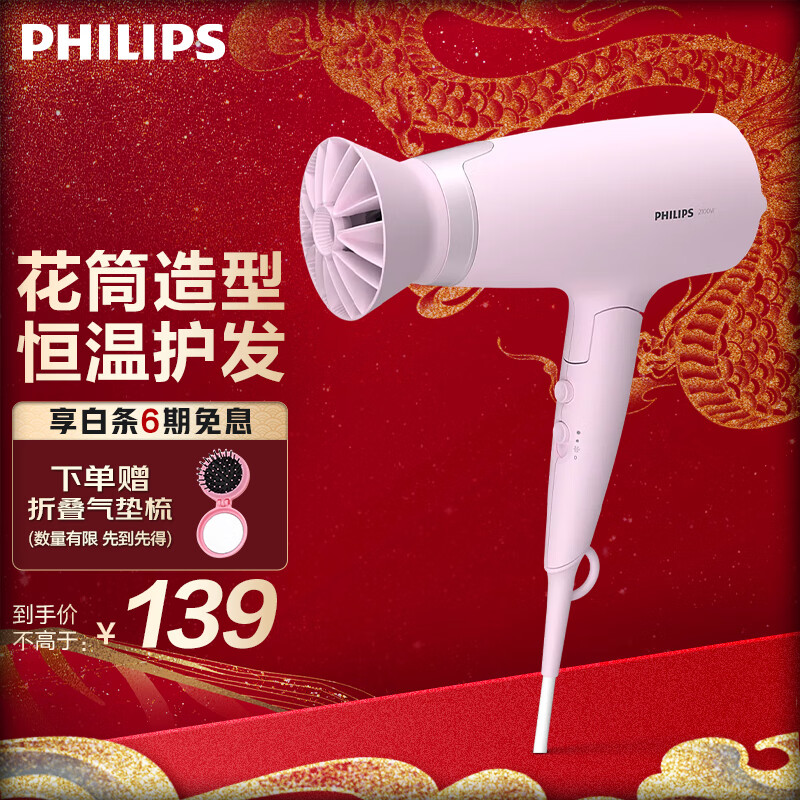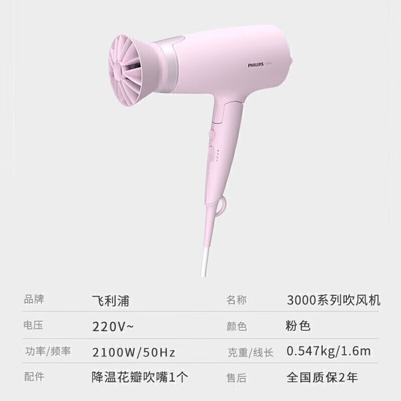 飞利浦(PHILIPS)电吹风机家用大功率 恒温速干 发廊沙龙专业级吹风筒 负离子+2100W+6档丨BHD388粉价格:209.00元!