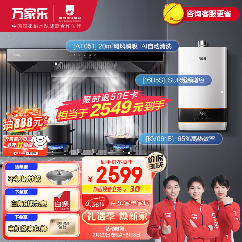 万家乐烟灶热三件套装 20立方挥手烟灶16L增容四季随温感热水器多件套装AT051+KV061B+16D5S天然气价格:2799.00元!