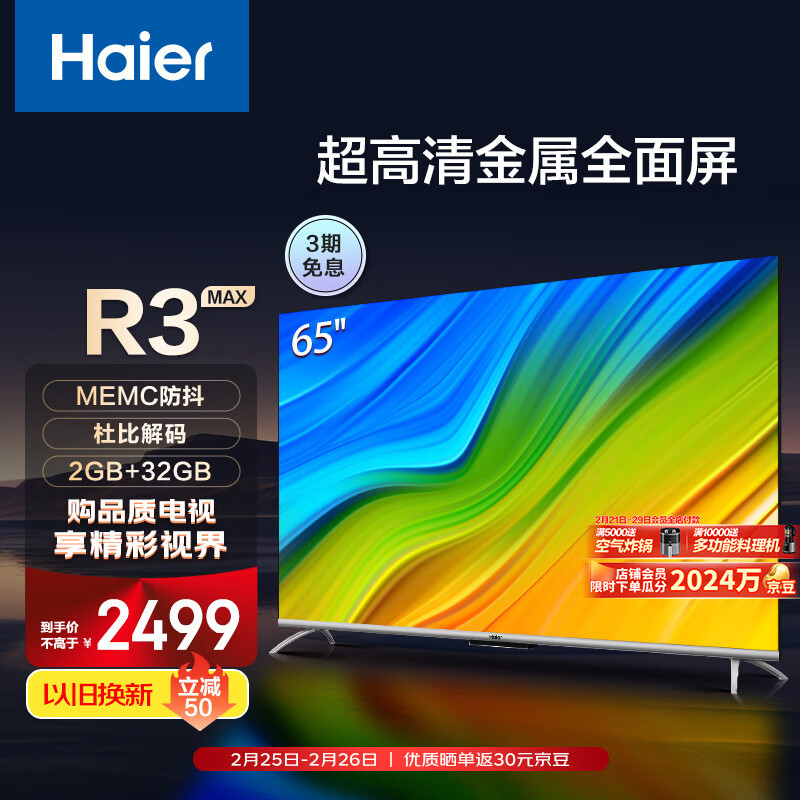 海尔(Haier)65R3-MAX 65英寸超薄金属屏电视 MEMC防抖 远场语音 4K超高清 2+32G大内存智能液晶电视价格:2499.00元!