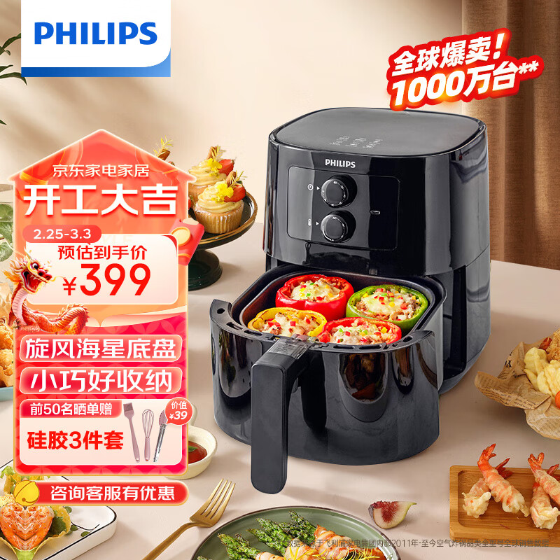 飞利浦(PHILIPS)空气炸锅 家用4L以上减少90%油脂 全自动4倍速热不用翻面 易拆卸清洗HD9200/91价格:399.00元!