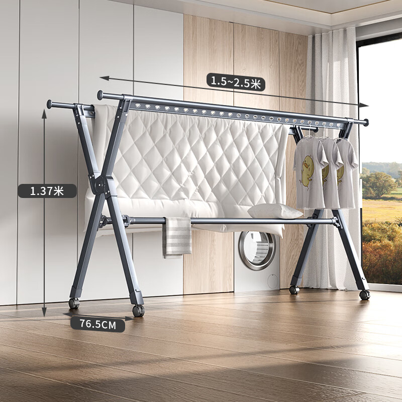 这款豪客家星空灰X型四杆+滚轮【1.5M-2.4M】还不错的,家里没有地方安装晾衣架,所以买落地的,这个很宽,,可以晾床单被罩,很稳当