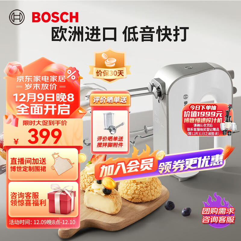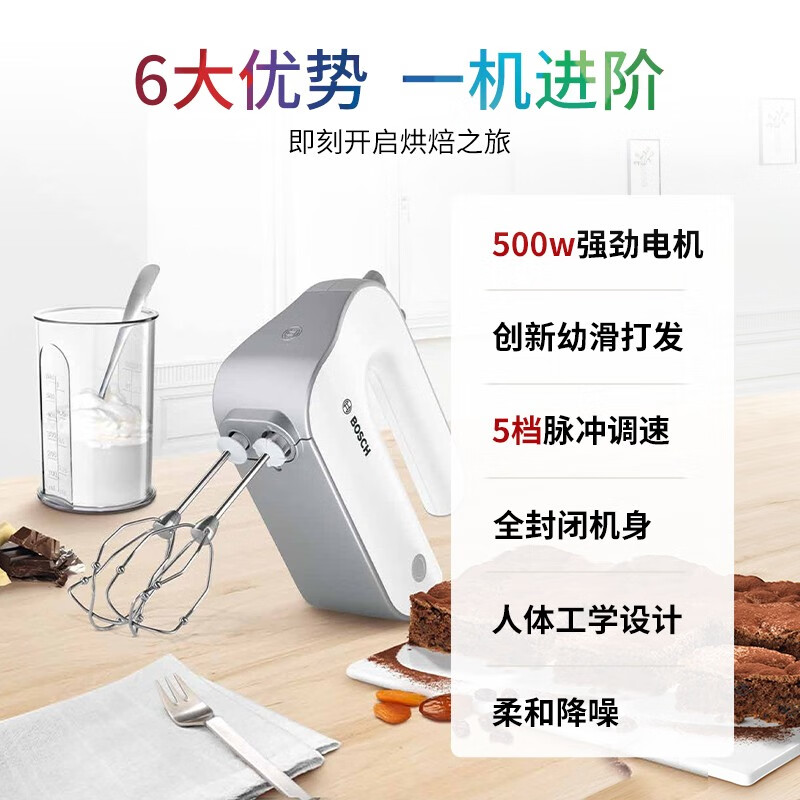 博世(BOSCH)轻音防溅电动打蛋器家用小型烘焙大功率打蛋机搅拌机MFQM440WCN价格:399.00元!