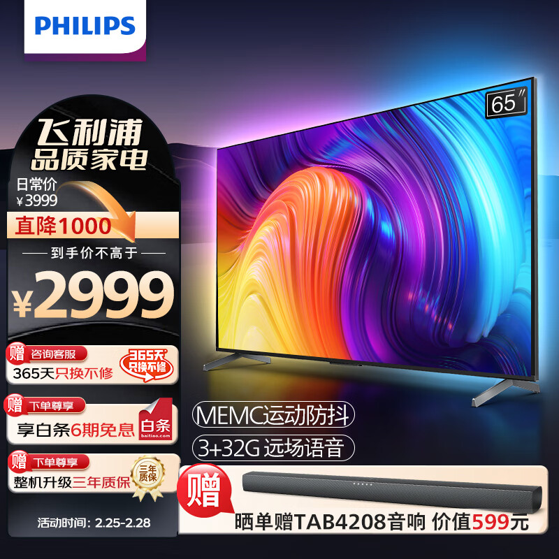 飞利浦(PHILIPS)65英寸4K超高清 3+32G环景光 流光溢彩艺术电视 网络智能投屏液晶平板电视机65PUF8297/T3以旧换新价格:2999.00元!