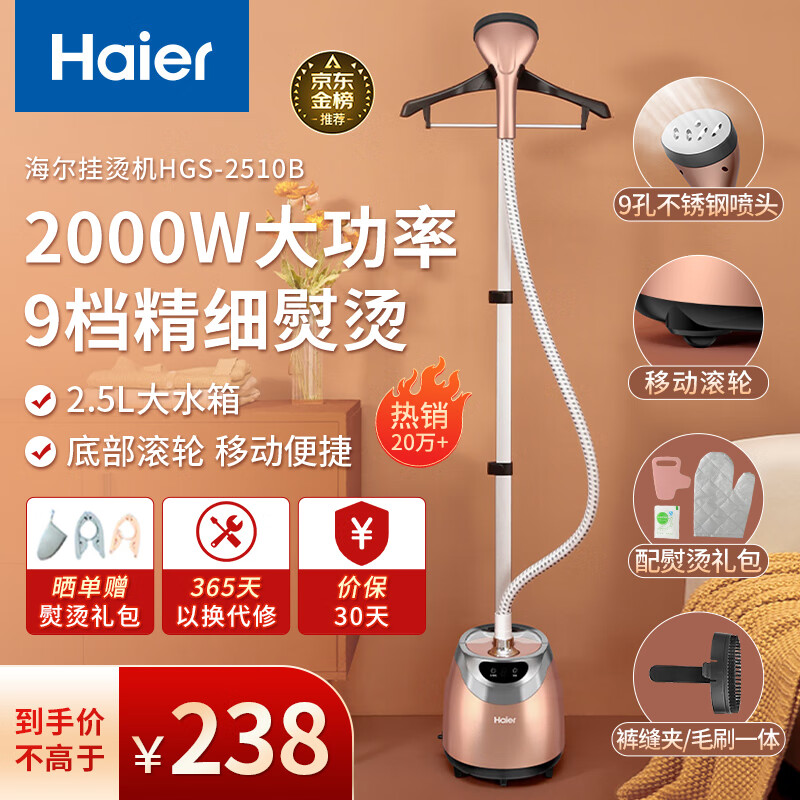 海尔(Haier)挂烫机家用2.5L大功率熨烫机手持立式蒸汽电烫斗衣物护理机服装店高温杀菌烫衣机电熨斗HGS-2510B价格:258.00元!