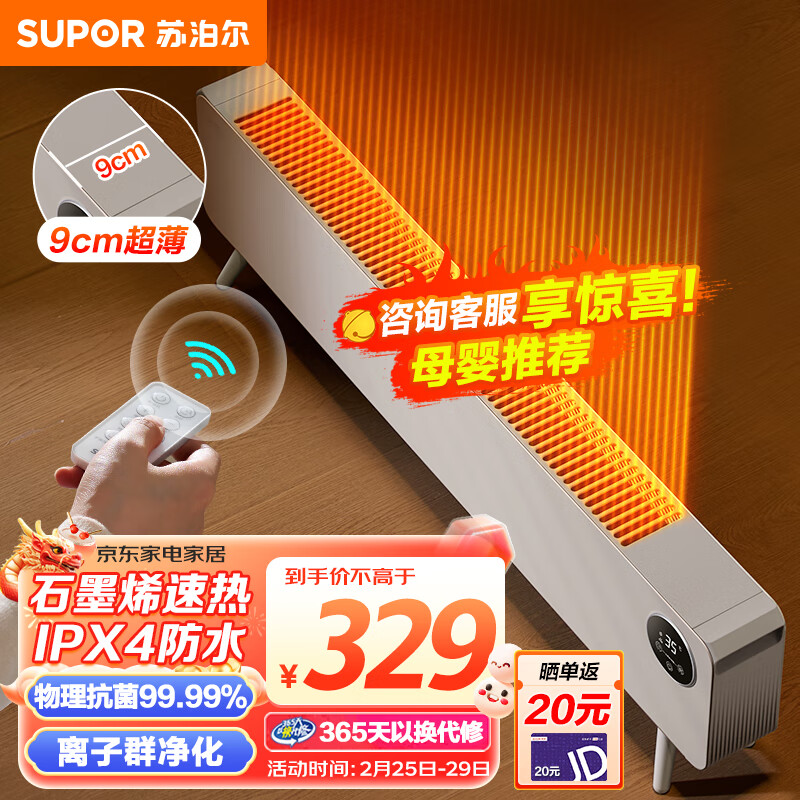 苏泊尔踢脚线石墨烯电热取暖器家用电暖器暖风机浴室电暖气干衣IPX4级防水移动速热地暖L05A价格:329.00元!
