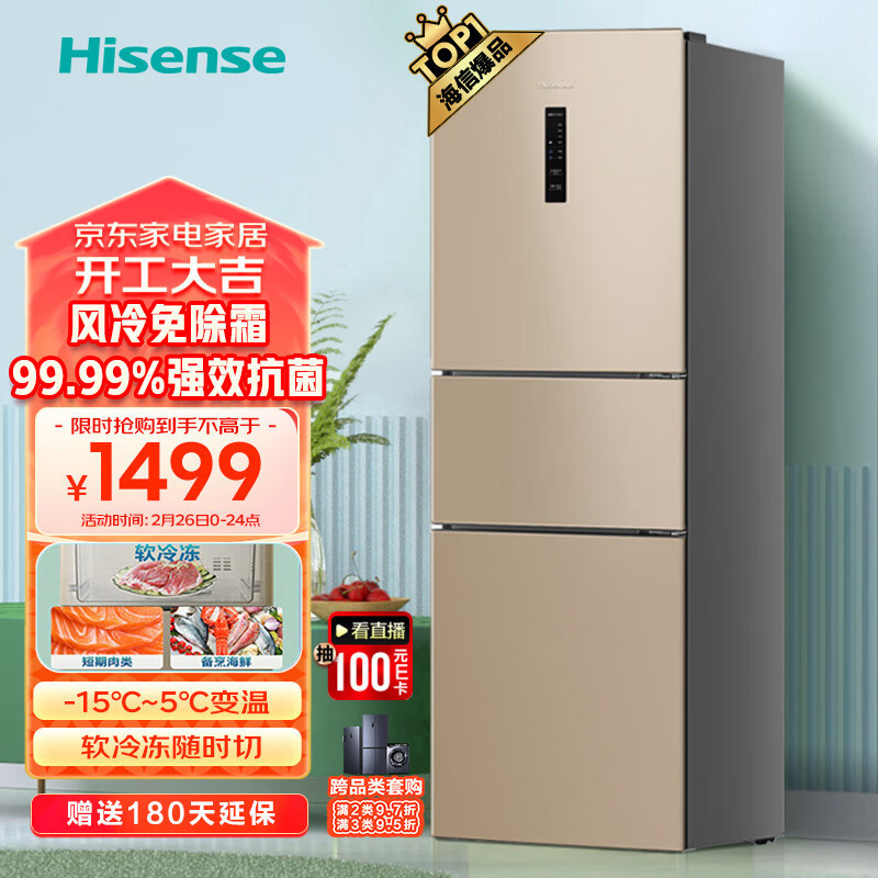 海信(Hisense)三开门冰箱小型无霜冰箱220L家用小户型租房用BCD-220WYK1DQ节能省电价格:1499.00元!