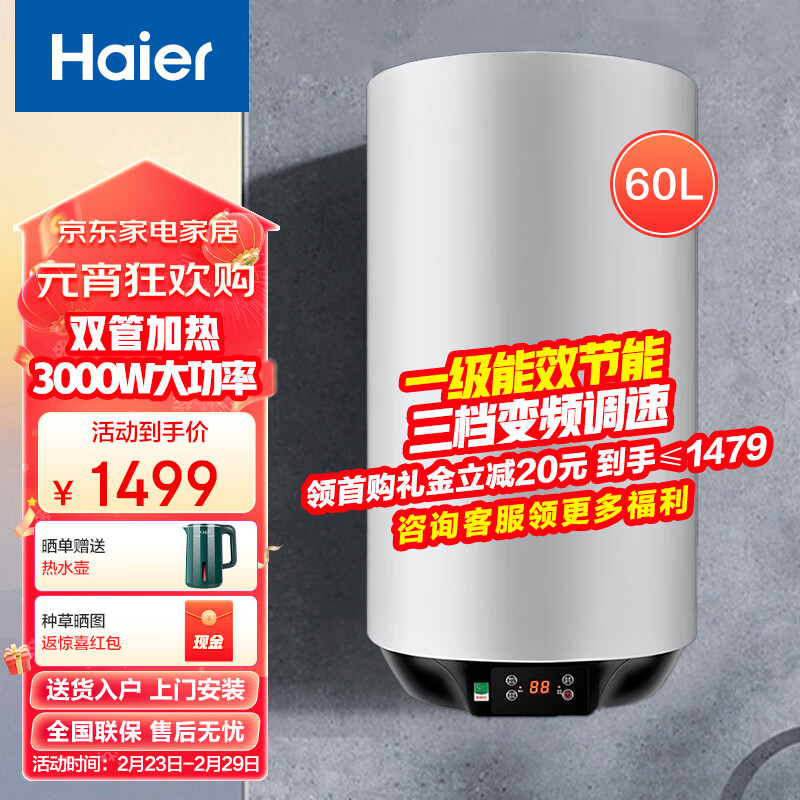 海尔(Haier)立式热水器 60升家用变频3000W速热竖式电热水器 一级能效节能即热储水式预约洗浴增容U1[家电]价格:1499.00元!
