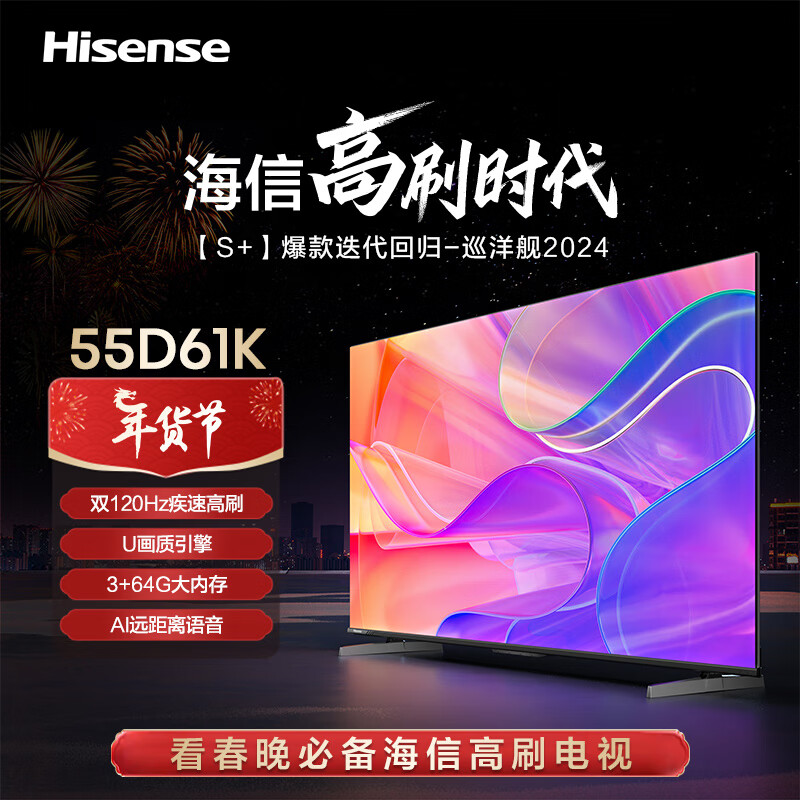 海信电视 55D61K 55英寸 3+64GB大内存AI智能语音 120Hz疾速刷新 U画质引擎价格:4599.00元!