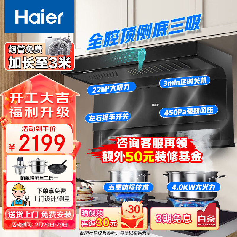 海尔(Haier)抽油烟机燃气灶套装 7字型顶侧双吸挥手智控 22m3大吸力吸脱排油烟机EC710+4.0KW液化气Q235[家电]价格:2399.00元!