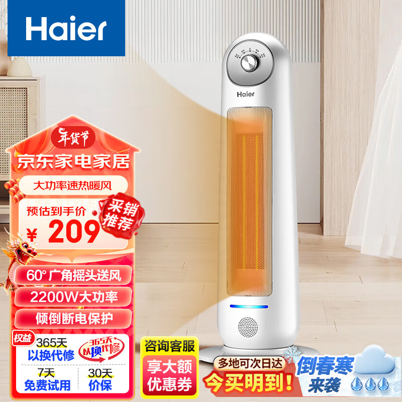海尔取暖器家用暖风机立式电暖风浴室电暖气小太阳电暖器卧室办公室烤火炉省电节能HN2203A价格:209.00元!