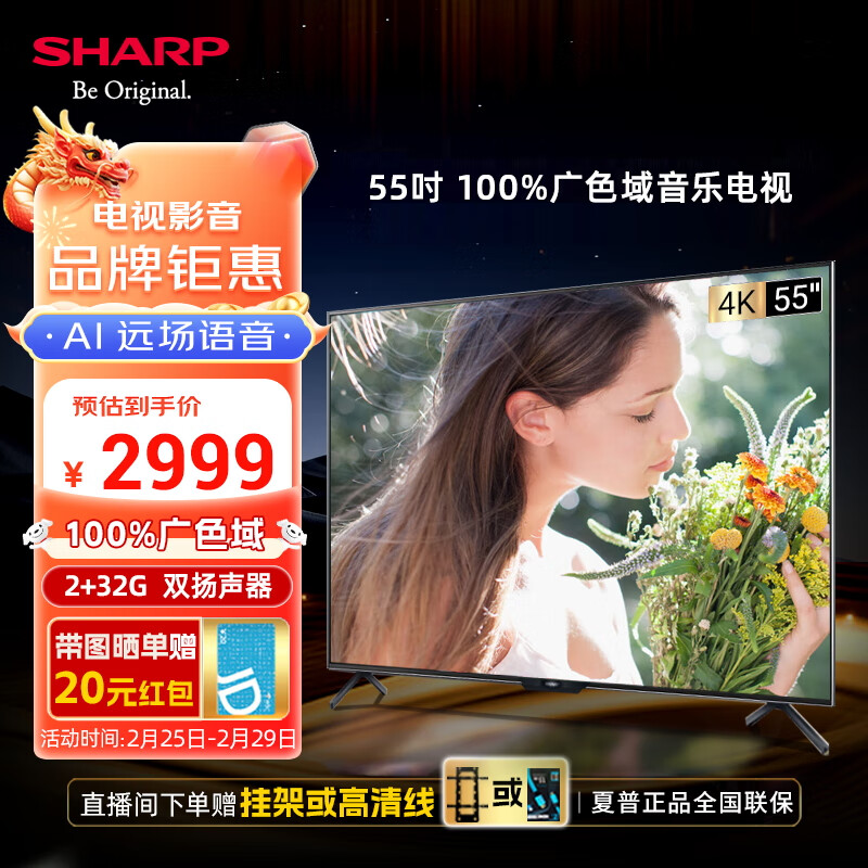 SHARP夏普4T-M55Q5EA 55吋 100%广色域 2+32G 96.1%屏占比 双扬声器 HDR10+HLG 杜比音效 超薄智能电视价格:2999.00元!