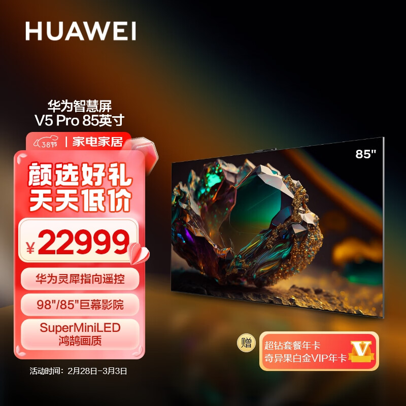 华为智慧屏 V5 Pro 85英寸 灵犀指向遥控MiniLED 超薄屏4K超高清智能巨幕护眼液晶电视机HD85ARKA价格:22999.00元!