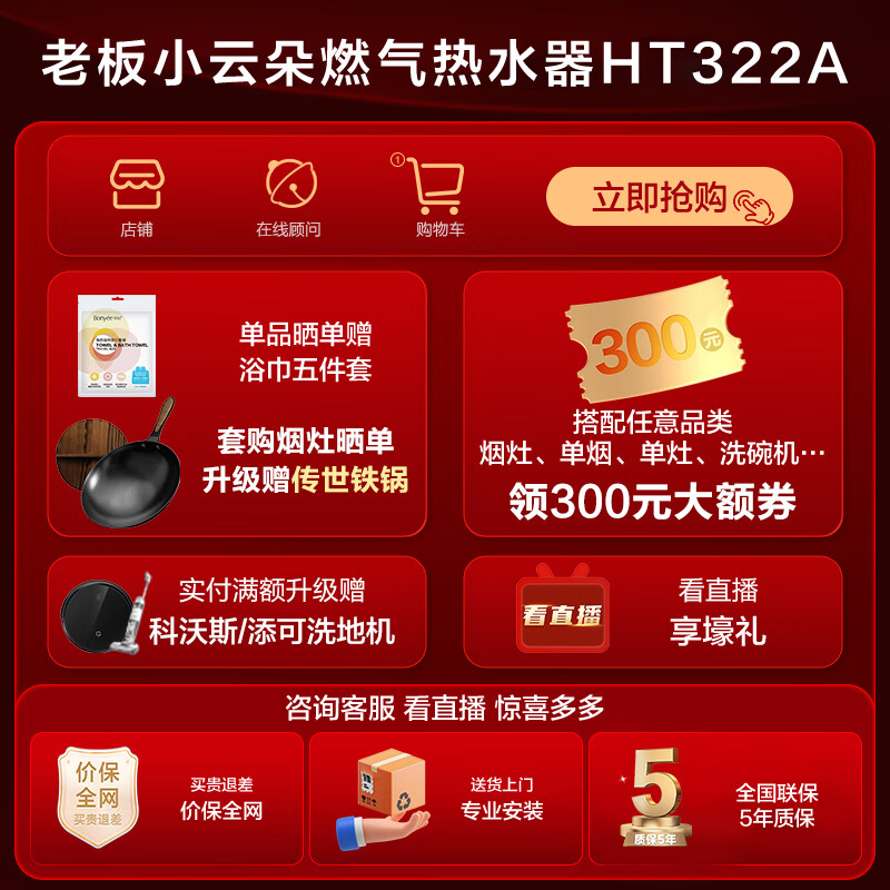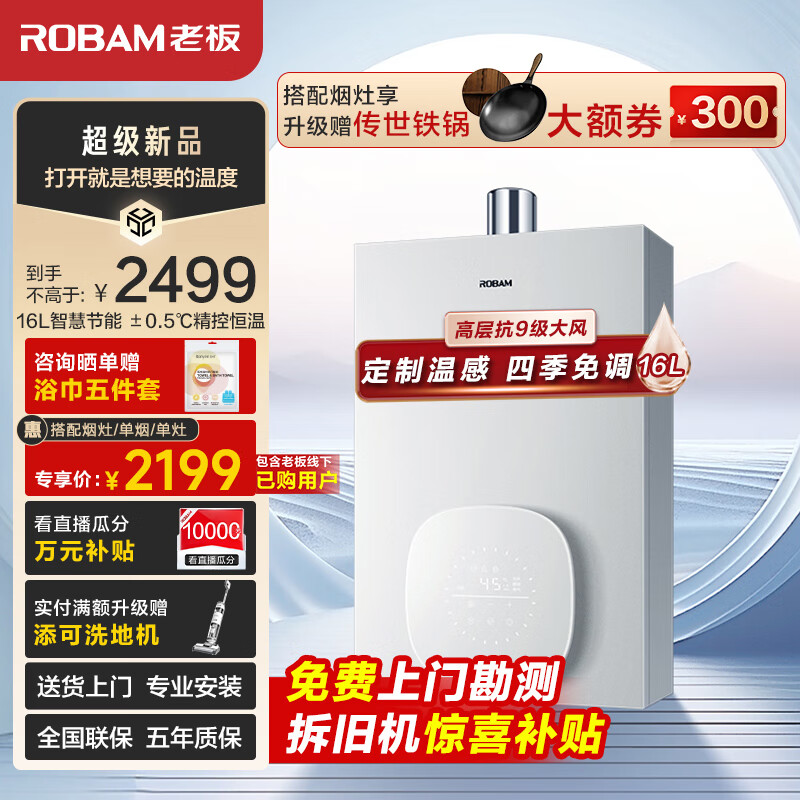 老板(Robam)小云朵16升燃气热水器天然气匀氧稳燃小尺寸智能恒温降噪高层抗风防冻家用强排式JSQ31-HT322A-16价格:2499.00元!