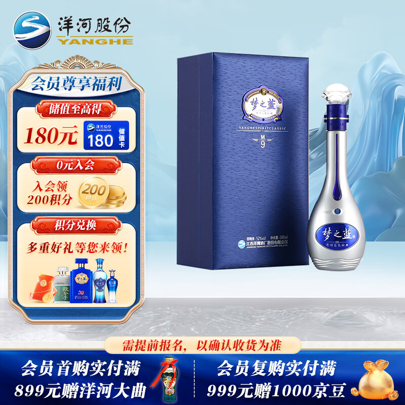 洋河 梦之蓝M9 52度 500ml 单瓶装 绵柔浓香型白酒价格:2098.00元!