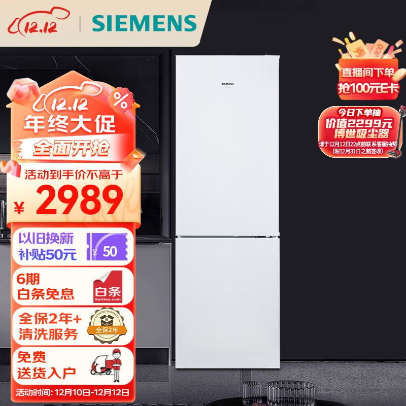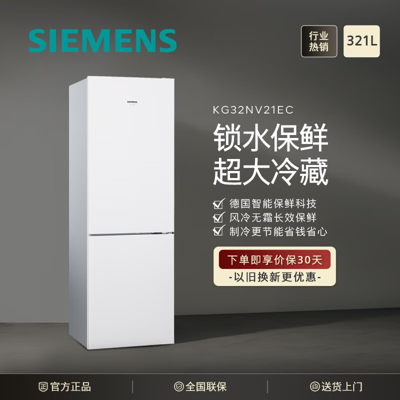 西门子(SIEMENS) 321升风冷无霜双门大容量家用冰箱 双效过滤 超大冷藏 白色 以旧换新(KG32NV21EC)价格:2989.00元!