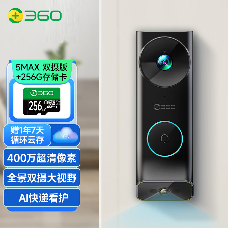 360 可视门铃双摄5 Max 双摄像头家用监控智能摄像机 2.5K智能门铃电子猫眼 无线wifi 400W超清夜视R5MAX价格:699.00元!