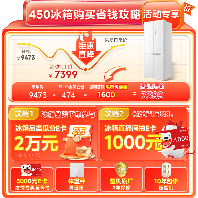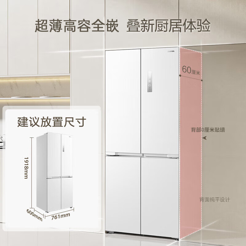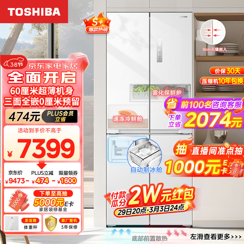 东芝(TOSHIBA)450白珍珠60厘米超薄零距离嵌入式十字对开门大容量家用电冰箱无霜变频GR-RF450WI-PM151荧纱白价格:9463.00元!