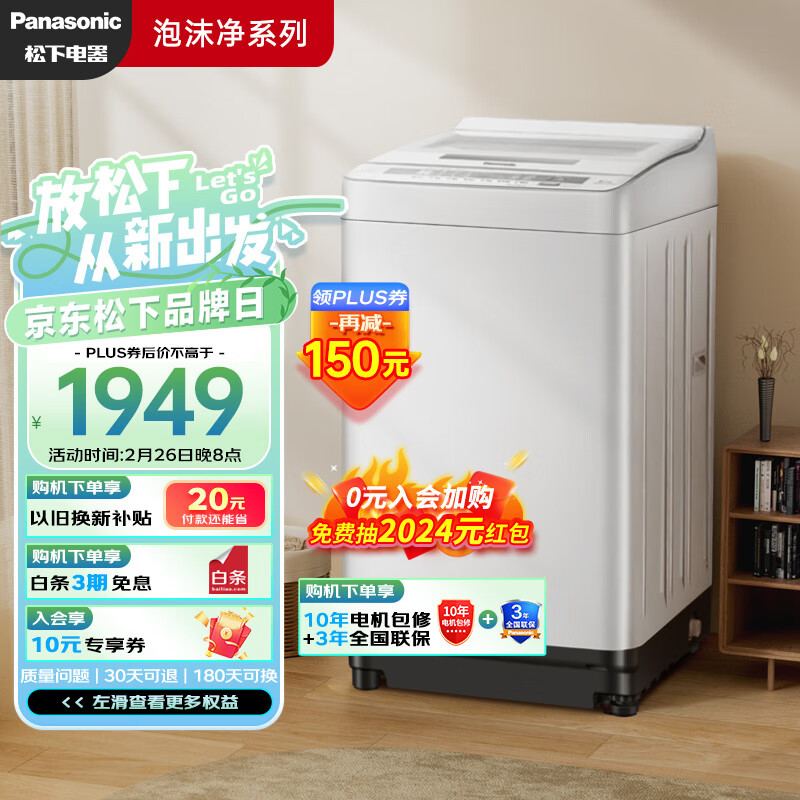 松下(Panasonic)波轮洗衣机全自动清净乐号 泡沫净去渍 线纸屑 桶自洁免清洗可预约10公斤以旧换新XQB100-H163W价格:2099.00元!