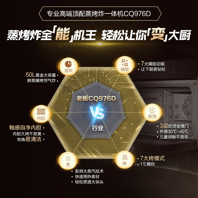 老板(Robam)CQ976D蒸烤箱一体机嵌入式50L家用全能蒸烤炸3合1蒸箱烤箱空气炸专业1℃精控三重自清洁釉感自净价格:4469.00元!