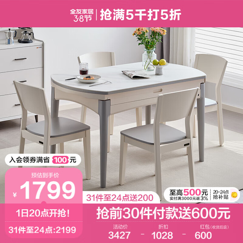 全友家居 餐桌椅 现代简约实木框架餐桌椅 可伸缩折叠岩板餐桌DW1028K价格:3427.14元!