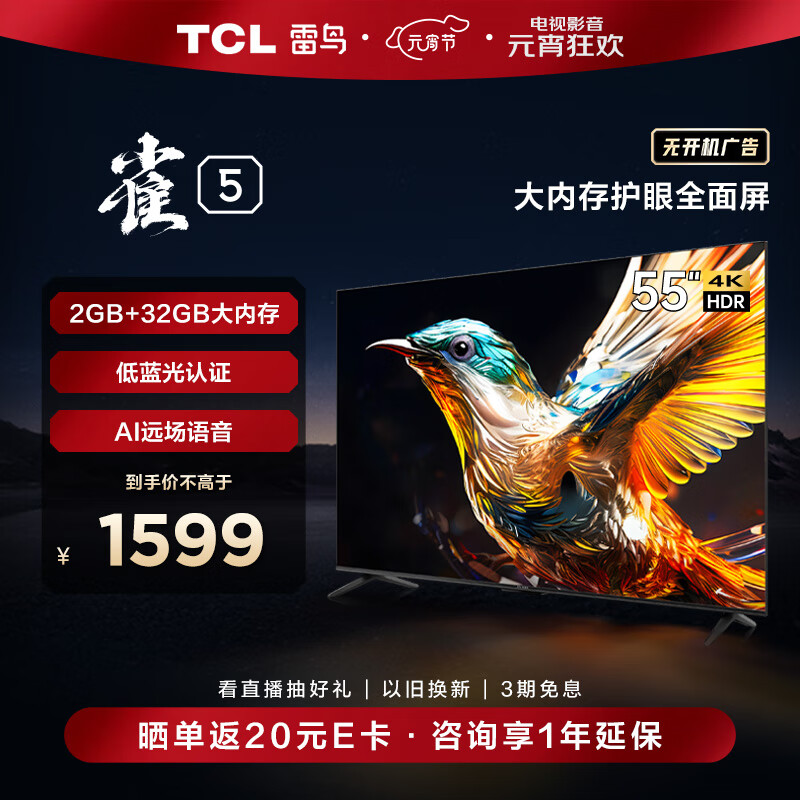 TCL雷鸟 雀5 55英寸 4K超高清 护眼防蓝光 超薄屏电视 2+32GB 游戏智能液晶平板电视机55F275C价格:1599.00元!