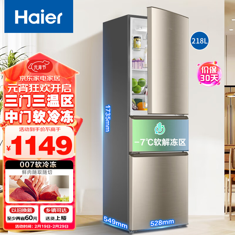 海尔(Haier)冰箱 218升独立三门三温区 中门软冷冻 低温补偿 家用节能省电直冷小冰箱 BCD-218STPS价格:1149.00元!