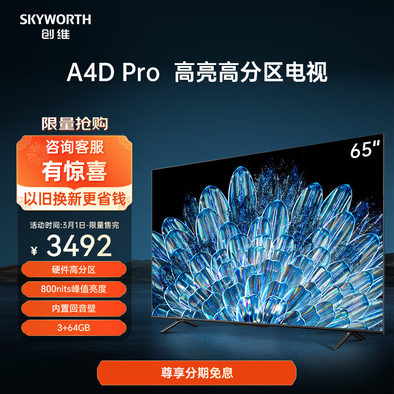 创维电视65A4D Pro 65英寸电视机硬件高分区800nits3+64G智慧屏彩电液晶4K超薄护眼游戏电视价格:3492.00元!