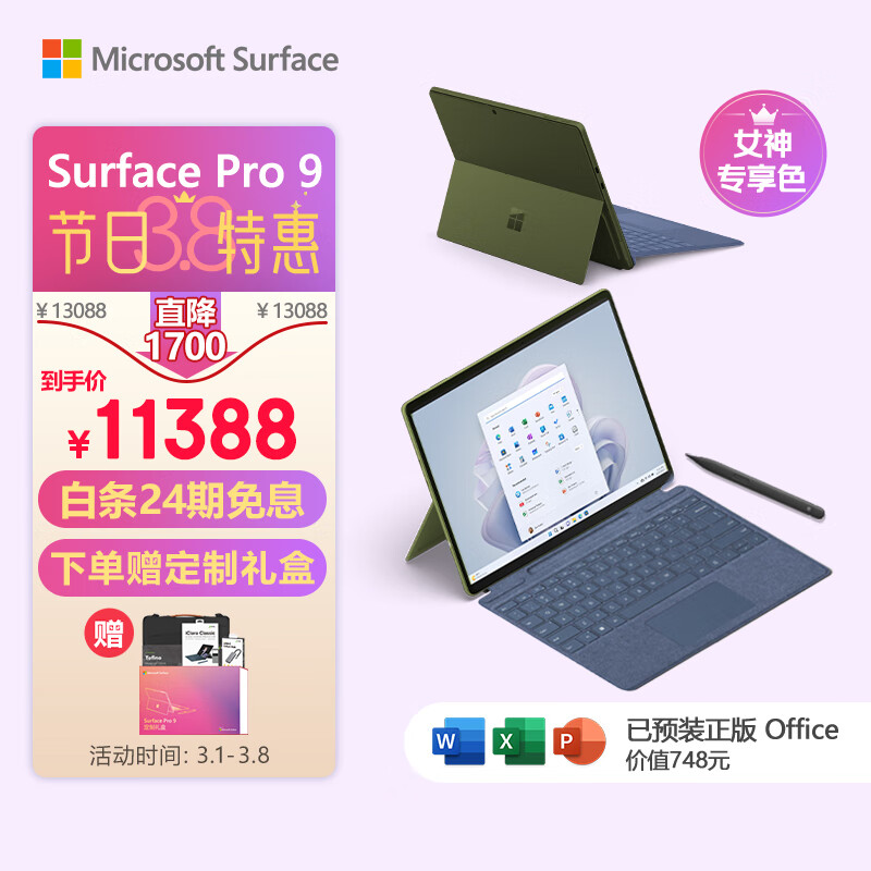 微软Surface Pro 9 森野绿+宝石蓝带触控笔键盘盖 i5 16G+256G 二合一平板电脑 13英寸120Hz屏笔记本价格:11388.00元!