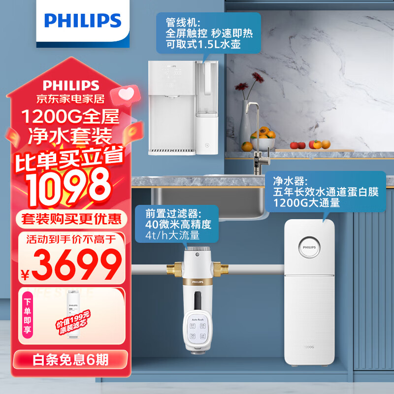 飞利浦(PHILIPS)家用净水器全自动冲洗前置管线机加热净水器套装【引擎1200G+管线机ADD4826+前置过滤器AWP1836】价格:3699.00元!