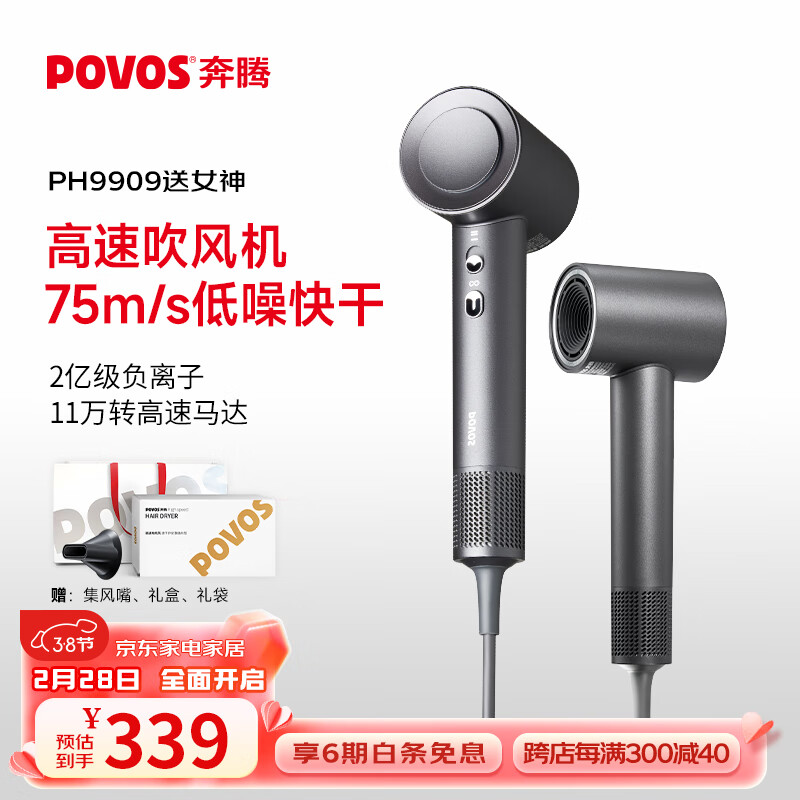 奔腾(POVOS)吹风机家用电吹风筒新一代大功率高速吹风机负离子大风力速干低噪音 PH9909灰礼盒装女神节礼物价格:619.00元!