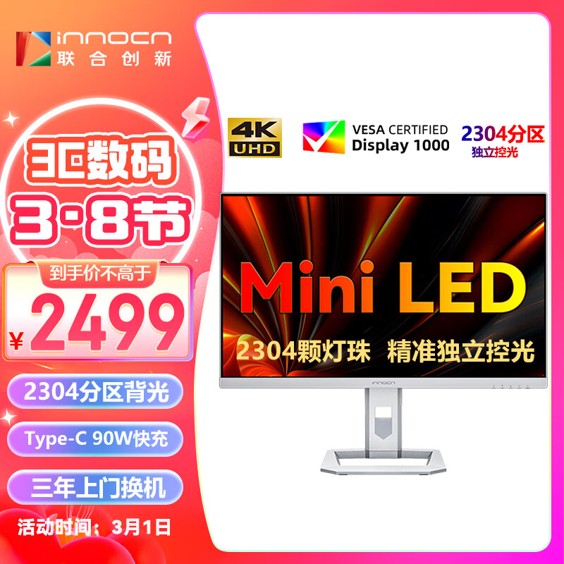联合创新(INNOCN)27英寸4K MiniLED 2304分区调光 自动感光Type-C 90W旋转升降HDR1000电脑显示器27M2U pro价格:3499.00元!