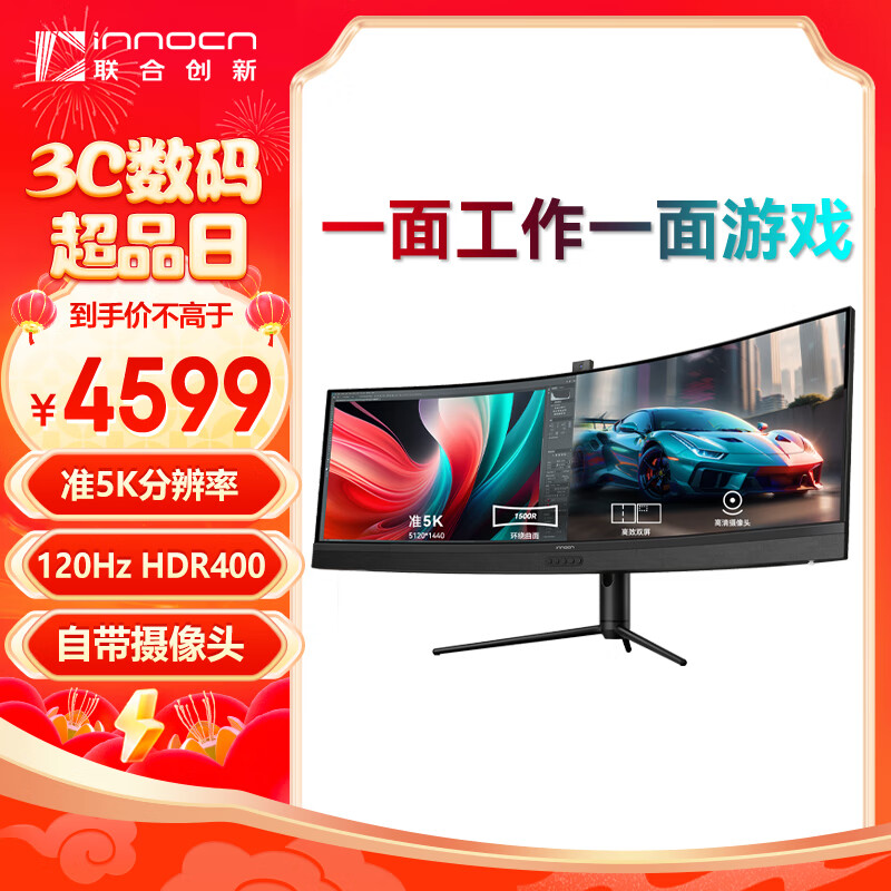 联合创新(Innocn)44.5英寸 准5K曲面带鱼屏32:9 120HZ Type-C90W RJ45网口 摄像头麦克风 电脑显示器45C1R价格:4999.00元!
